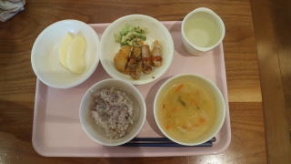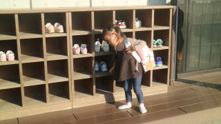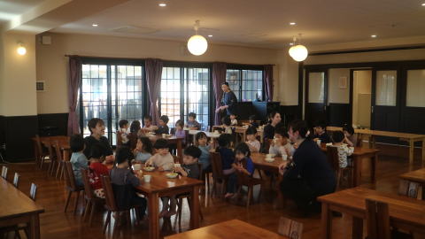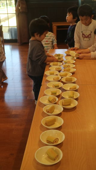 | 朝のおやつの時間。ランチルームへ。 「おやつをとって座りましょう!」たくさん並んでいるテーブルに戸惑いながらも座る席を探していました。 |