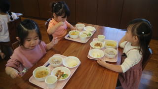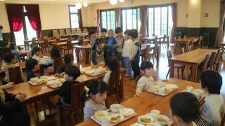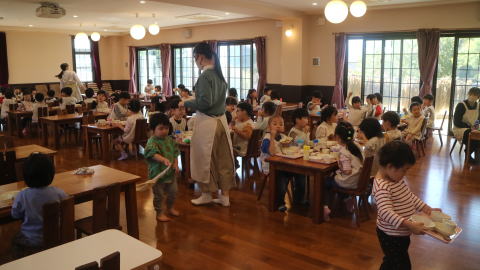 | 朝のおやつの時間。ランチルームへ。 「おやつをとって座りましょう!」たくさん並んでいるテーブルに戸惑いながらも座る席を探していました。 |