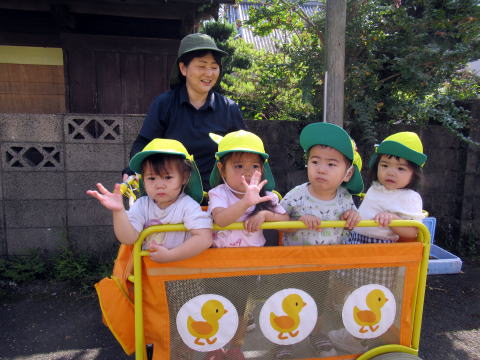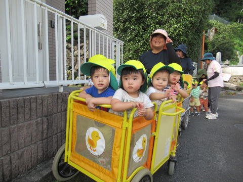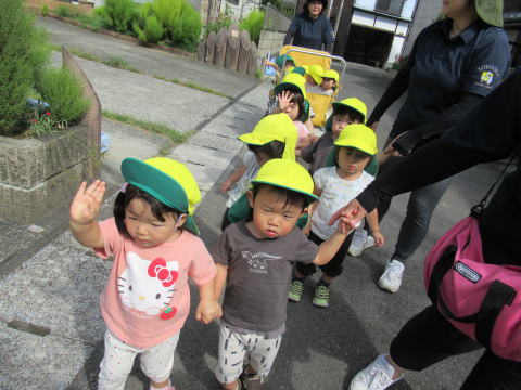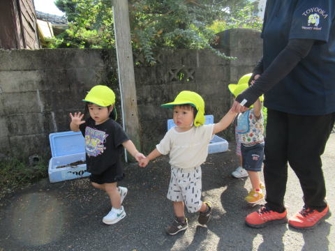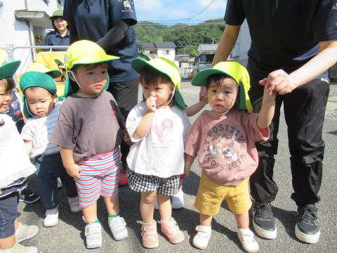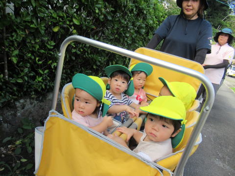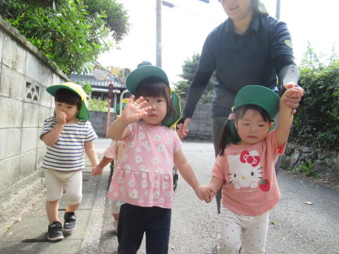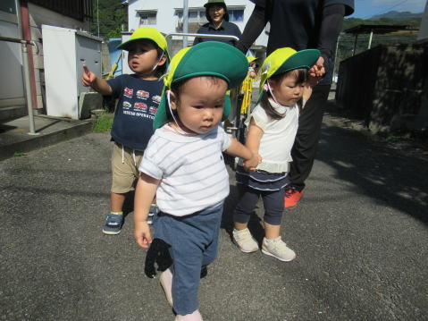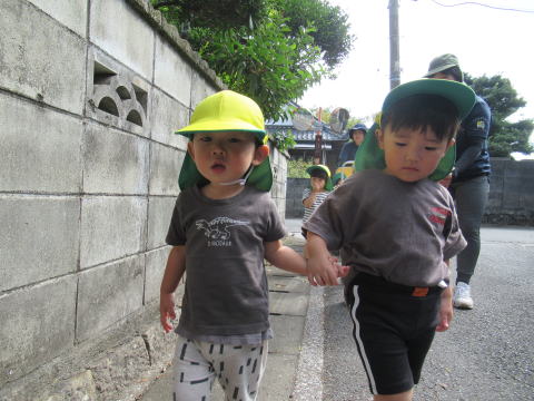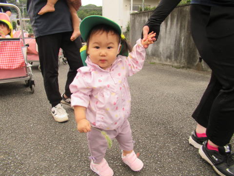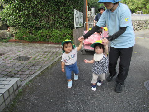 1歳児のこども達は少し長い距離を歩けるようになりお友達と手をつないで歩いていました。