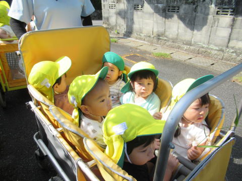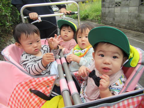まだハイハイのこども達はベビーカーにゆられ秋風を感じていました。