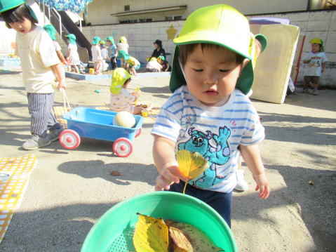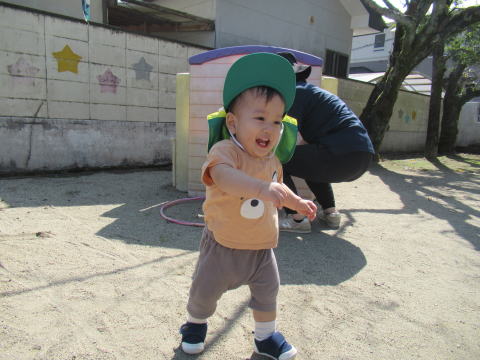 0歳児のこども達は歩くことが上手になり慣れない靴を履いて一生懸命足を前へ前へ。