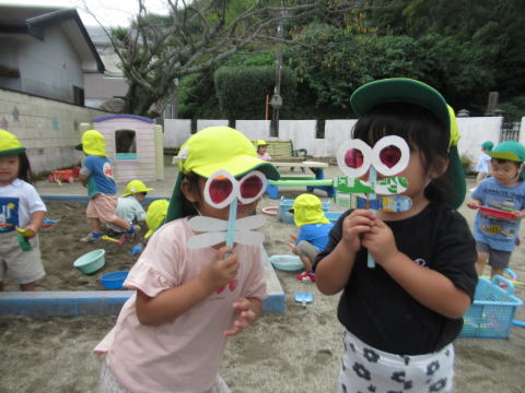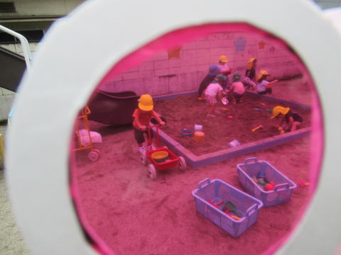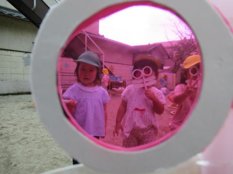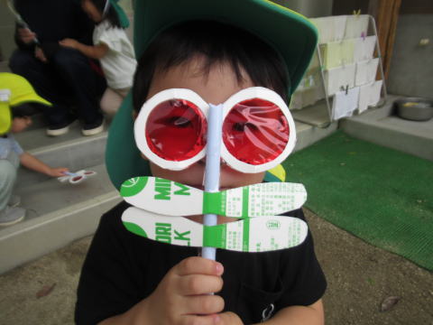 2歳児のこども達はトンボのメガネで色々な景色を楽しんでいました。