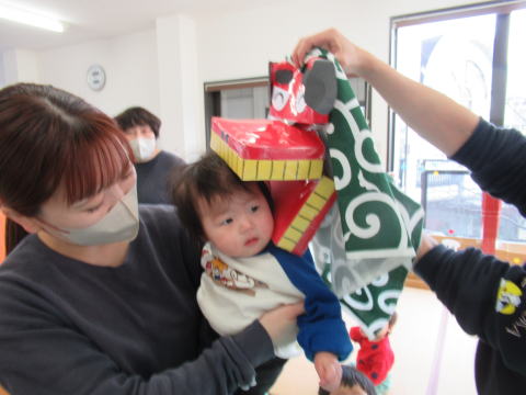 ![]() 0歳児のお部屋に獅子舞が遊びにきました。 |