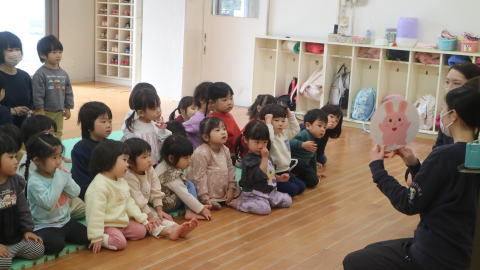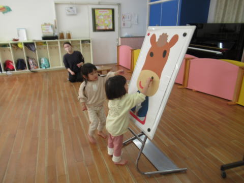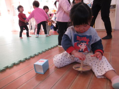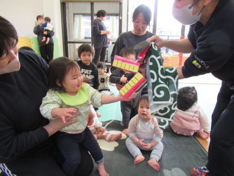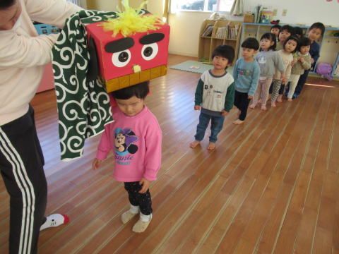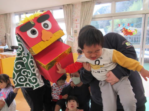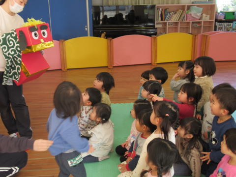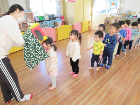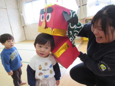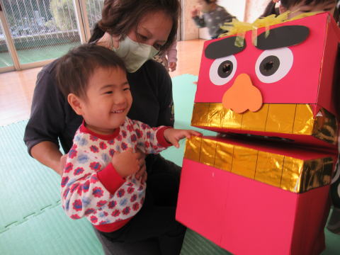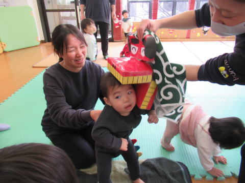 ![]() 1歳児と2歳児には少し大きな獅子舞が遊びにきてくれました。 |