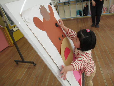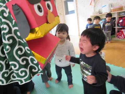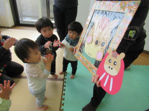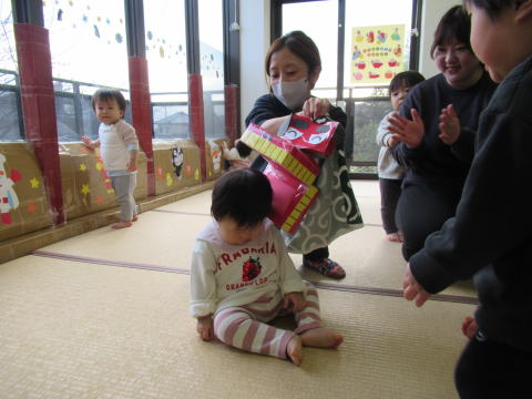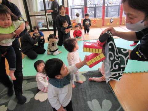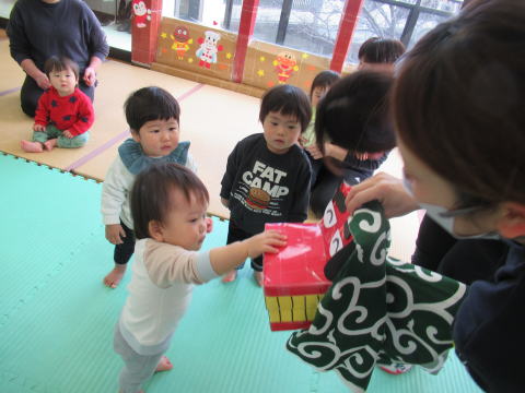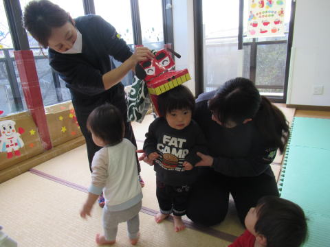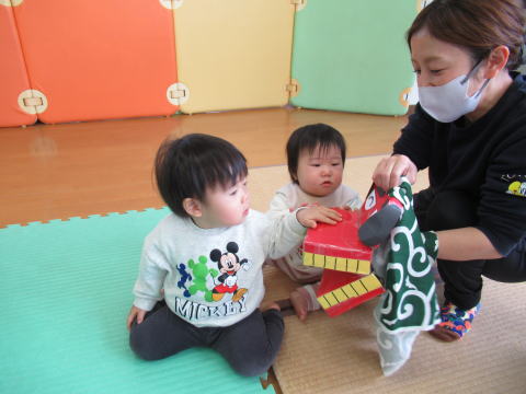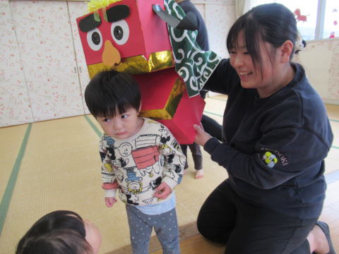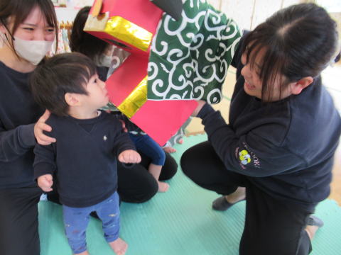 ![]() 0歳児のお部屋に獅子舞が遊びにきました。 |